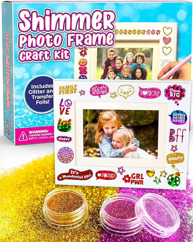 - Complete Decorate Your own Frame Craft Kit!! Our DIY kit has all you need to create a unique photo frame with bright, sparkling colors and varying textures. One white wood photo frame (that will hold a 4x6 or 5x7 photo), gold & pink glitter, foil transfers, and 2 sheets of awesome designs.