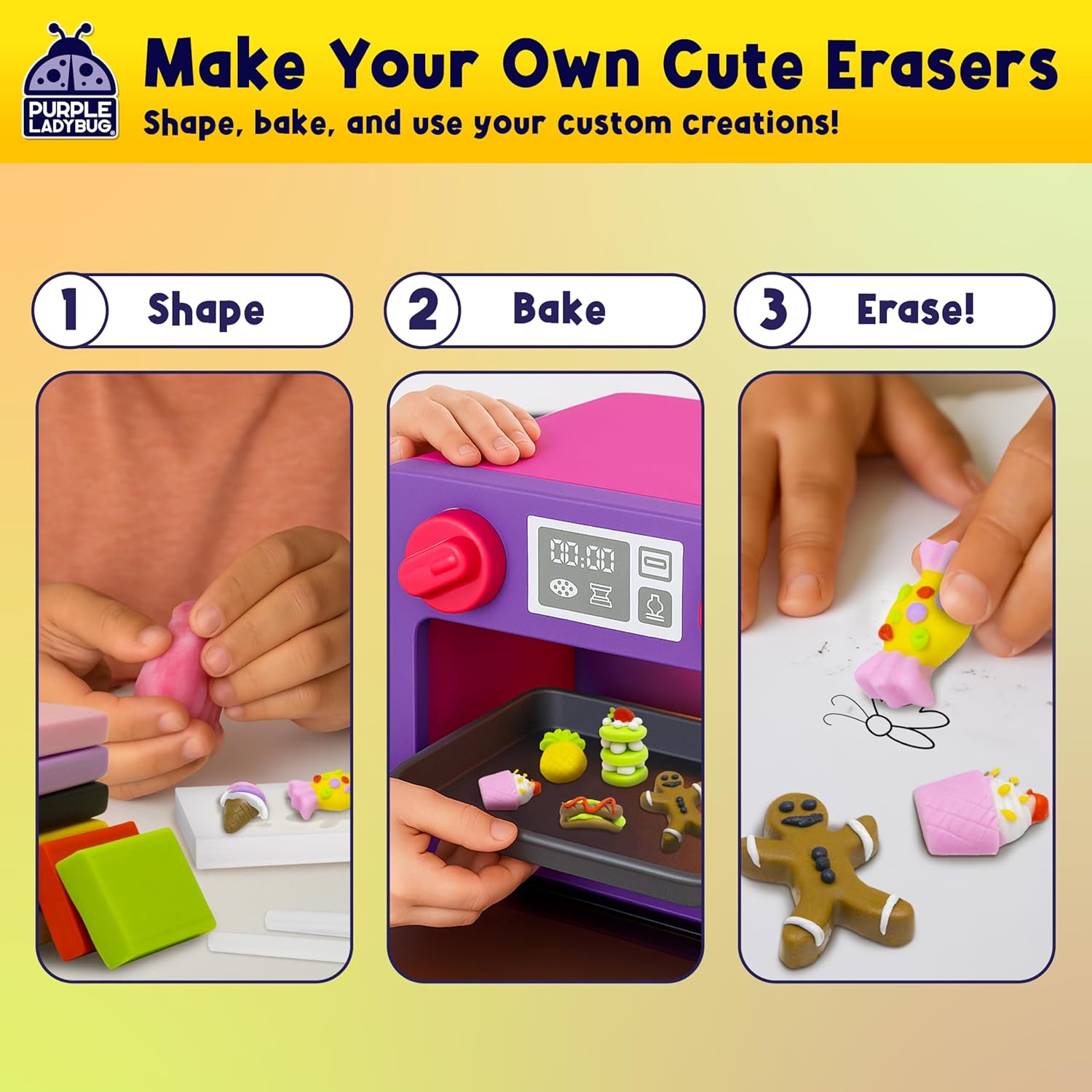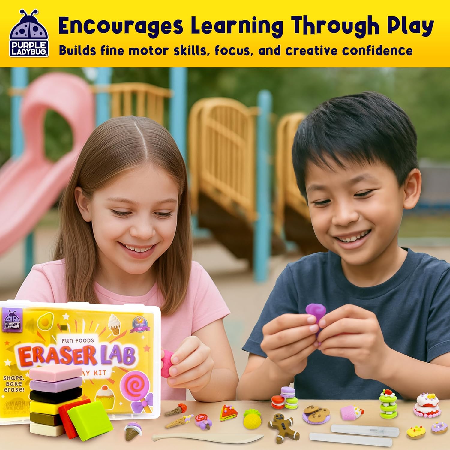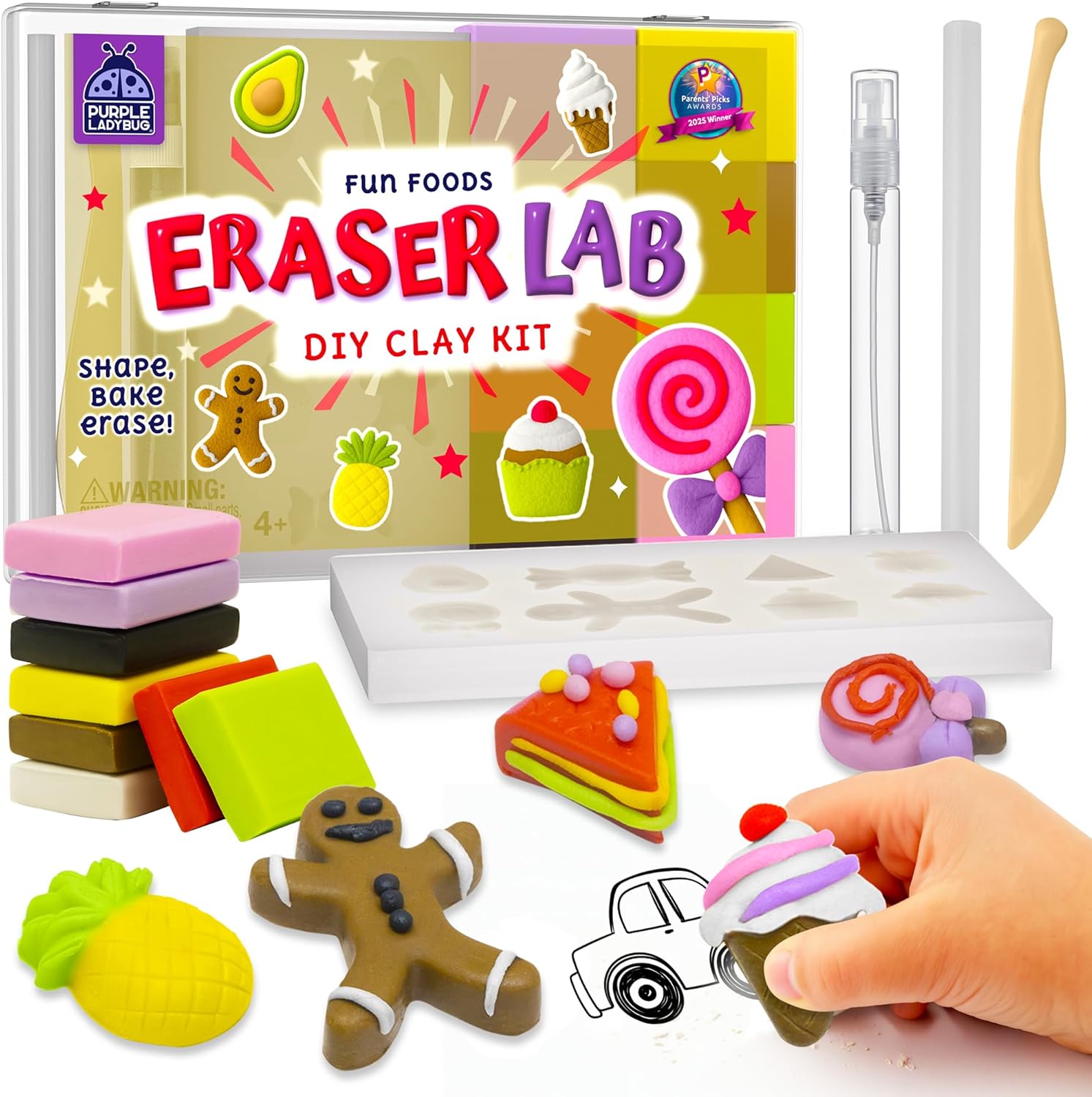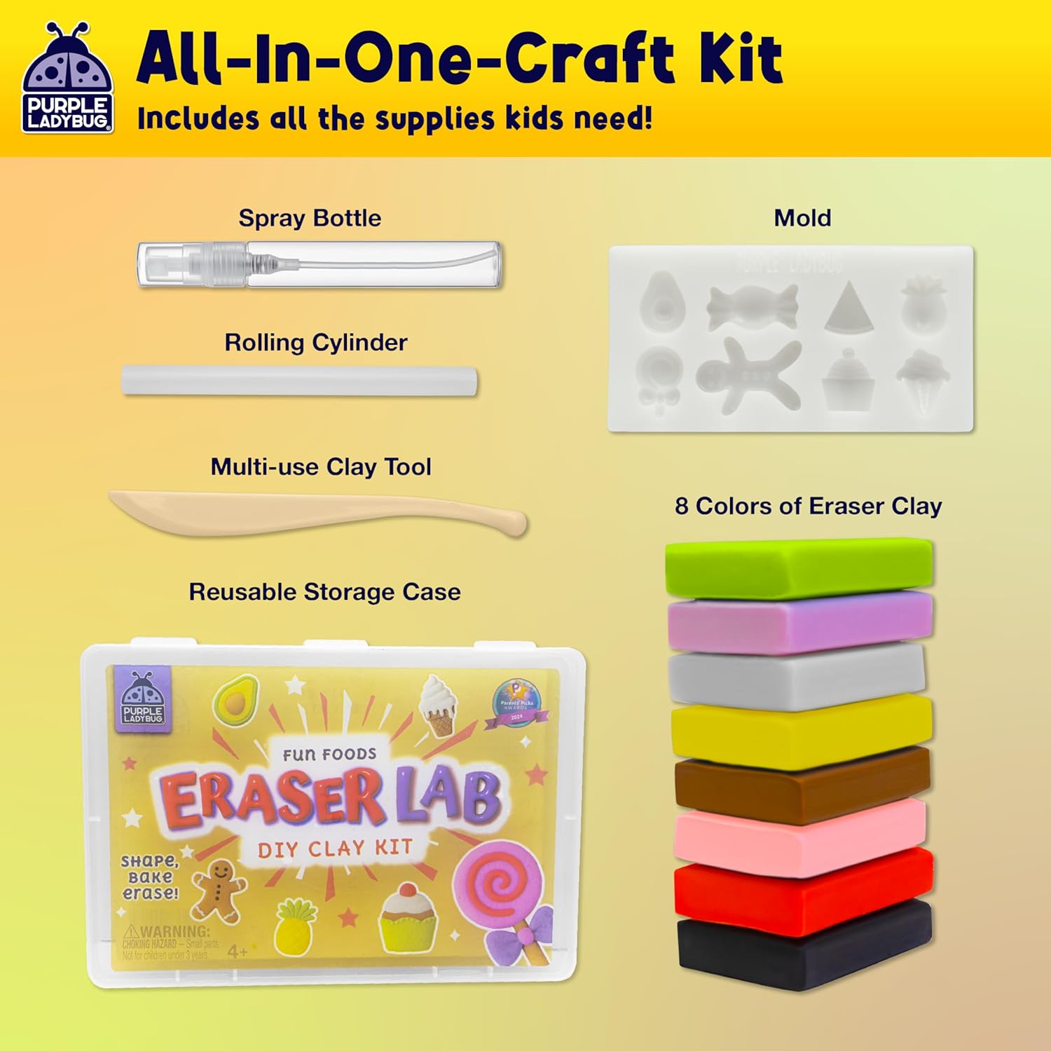 - MAKE YOUR OWN ERASERS IN FUN FOOD SHAPES: Your kids will have a blast shaping, baking (with adult assistance), and using their own custom mini erasers! With the Fun Foods EraserLab DIY Clay Craft Kit, they will turn soft, high-quality clay into fun, functional erasers. It’s a low-mess, hands-on craft that’s equal parts creative and practical - something your kids will proudly use and show off again and again.