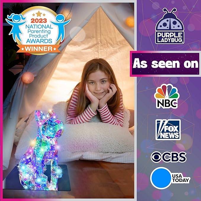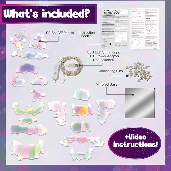 - What’s Included? Build-Your-Own Prismic: Dog Lantern includes Prismic panels, connecting pins, a mirrored base, USB-powered LED string lights, and full step-by-step written instructions (video instructions also available). It has everything you need to create a fun light up craft for tweens and teens!