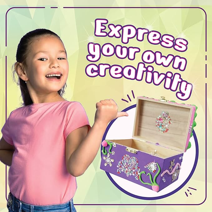 - Super fun craft kit!! This jewelry box or storage box for kids is actually an incredible customizable art kit! Each kit comes with one wood jewelry box, 5 colors of air dry spreadable clay, 1 sculpting tool and 4 sheets glitter gem stickers -- everything a child needs to decorate this kids jewelry box!