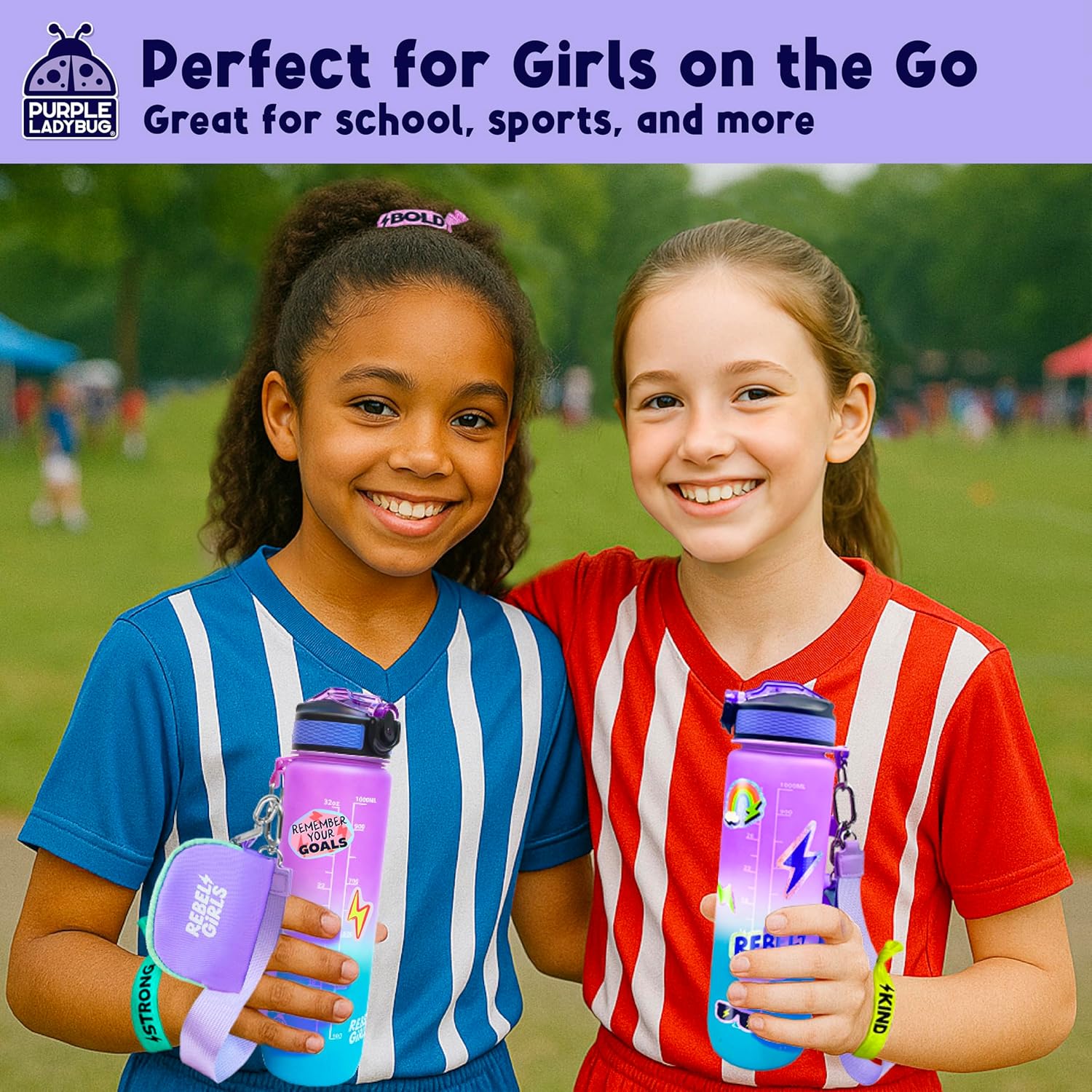 - EVERYTHING SHE NEEDS INCLUDED—AND MORE! Inside the box, you’ll find a 32 oz (1000 mL) ombré sports bottle with a flip-top lid and straw, 5 sheets of positive shimmery stickers, 4 Rebel Girls hair ties, plus we include awesome add-ons: a wrist leash for the bottle, and an attachable mini coin purse. Stylish, functional, and packed with value—she’ll love using it all!