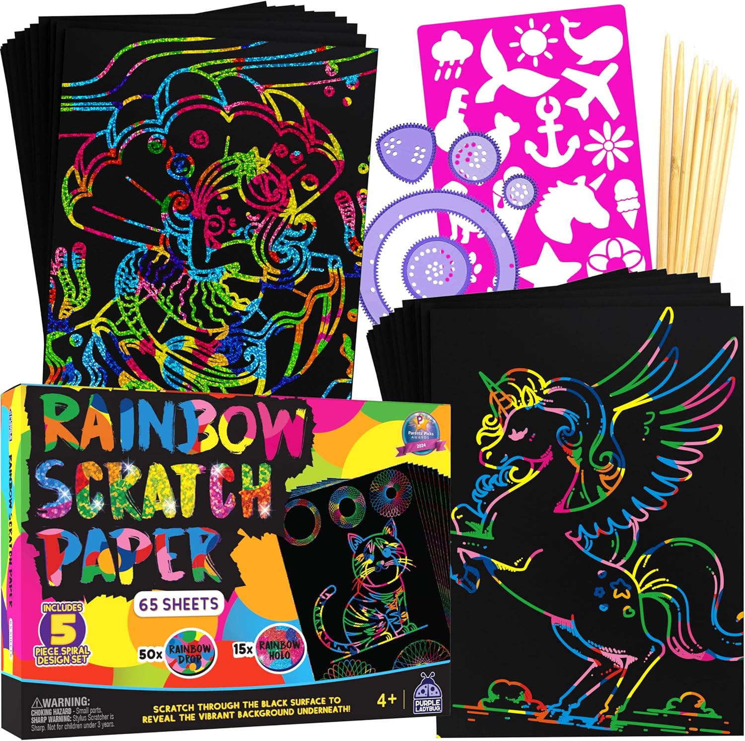 - TURN EVERY DOODLE INTO A MASTERPIECE! Our rainbow scratch paper art set, measuring 7.2" x 5" features 65 sheets of thick and high-quality scratch boards that won't easily tear when scratched - WOW! No more tiny or flimsy pages to worry about.